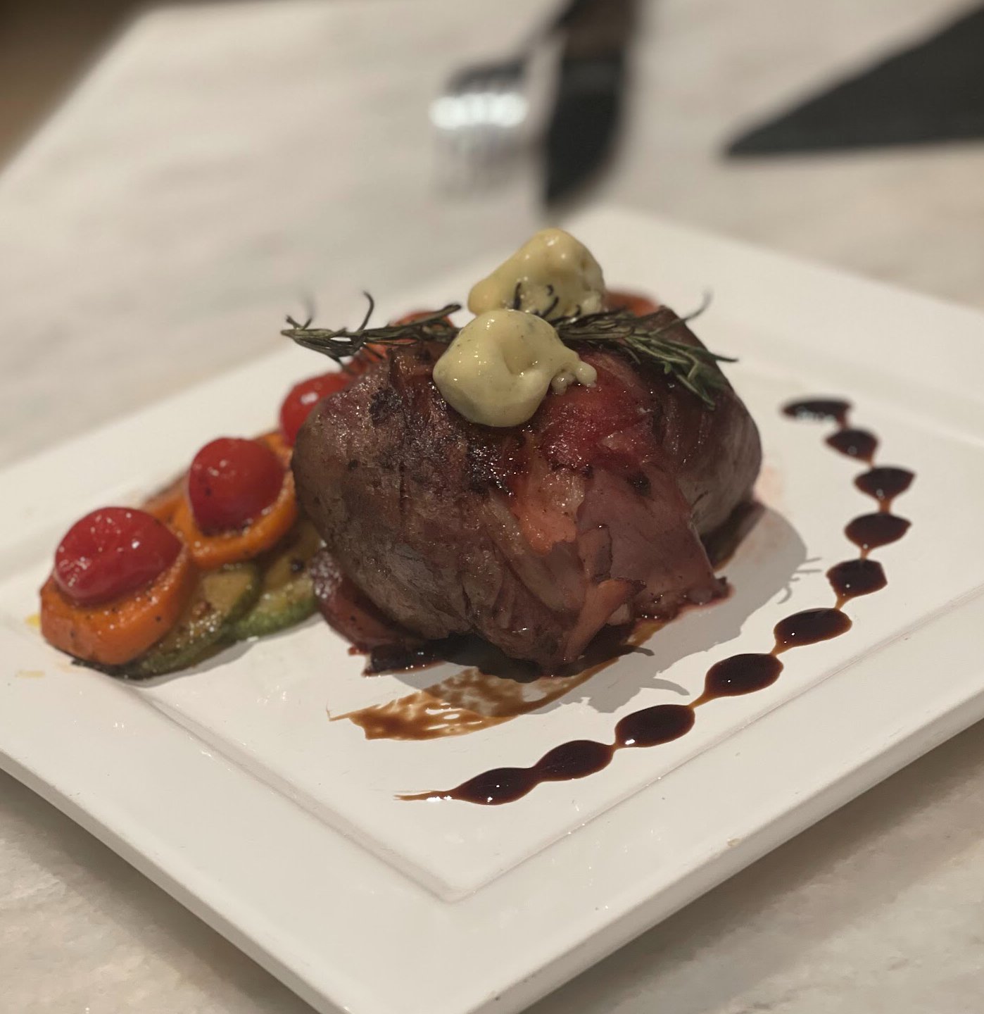 Con Queso Gorgonzola y Mix de Verduras Asadas.