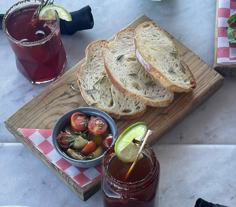 Pan Artesanal, Aceite de Oliva, Romero, Ajos Asados y Tomates Cherry.