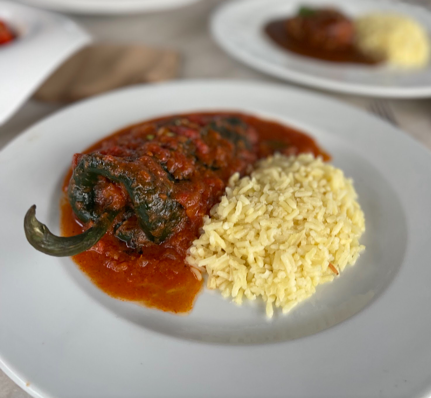 Chile Poblano Relleno de Queso y Frijoles,Cubierto con Salsa de Tomate, Arroz y Camarones.