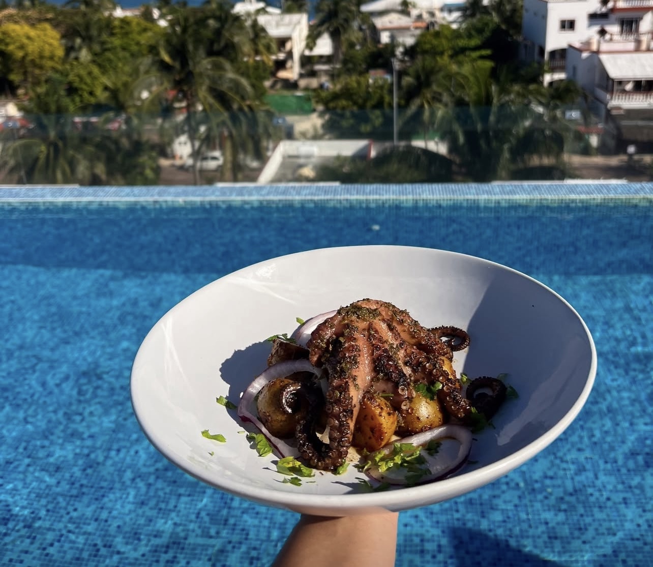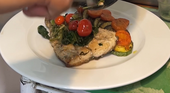 Mahi-Mahi al Sart茅n con Tomate Cherry, Aceite de Oliva, Ajo, Espinaca y Vegetales.