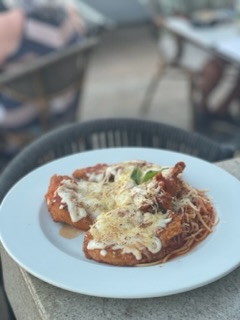 Pechuga de Pollo empanizada con Pomodoro y queso, acompa帽ada con pasta Pomodoro