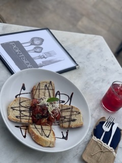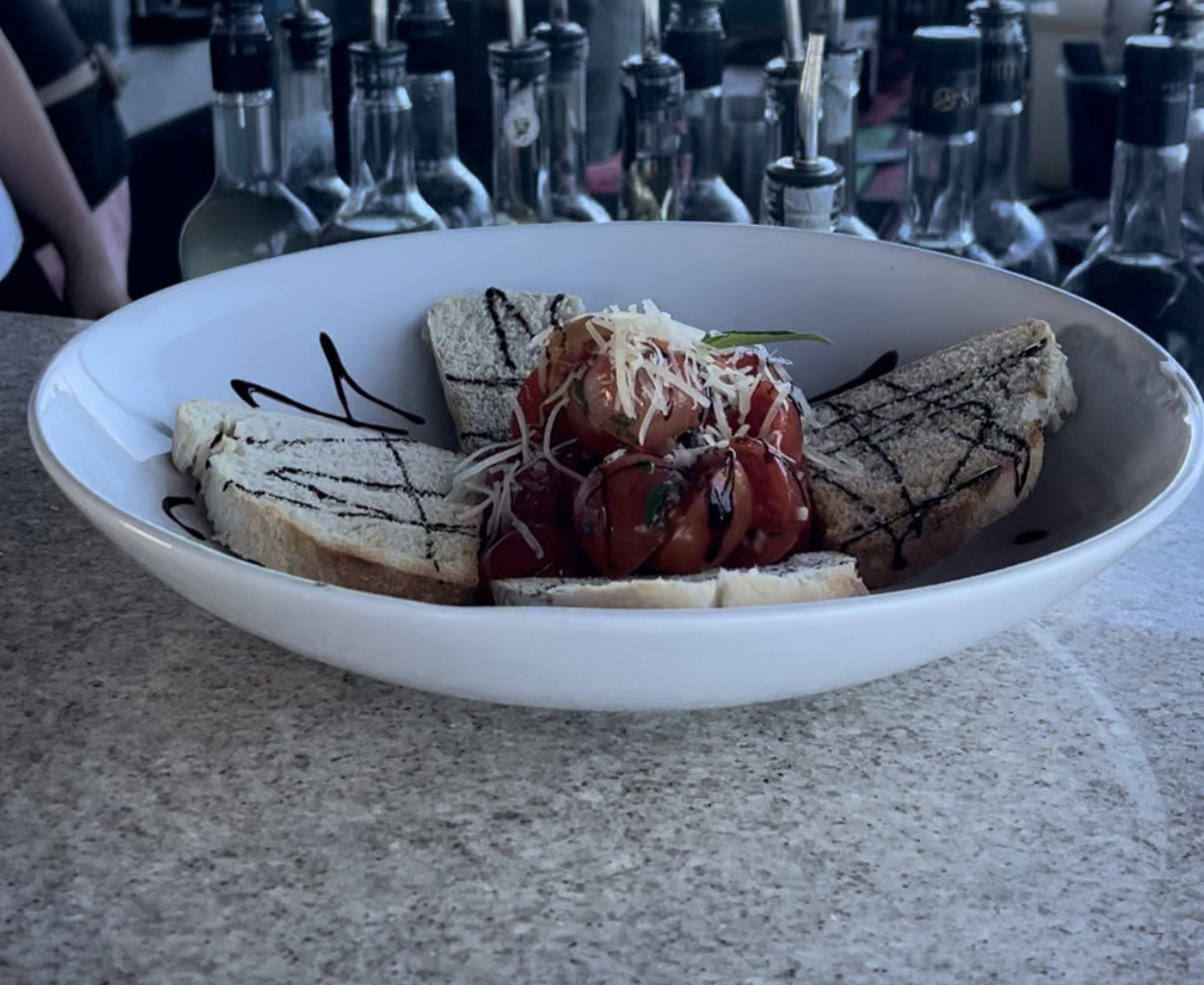Pan Tostado con Tomates Cherries, Ajos, Aceite de Oliva, Albahaca y Vinagre Bals谩mico.