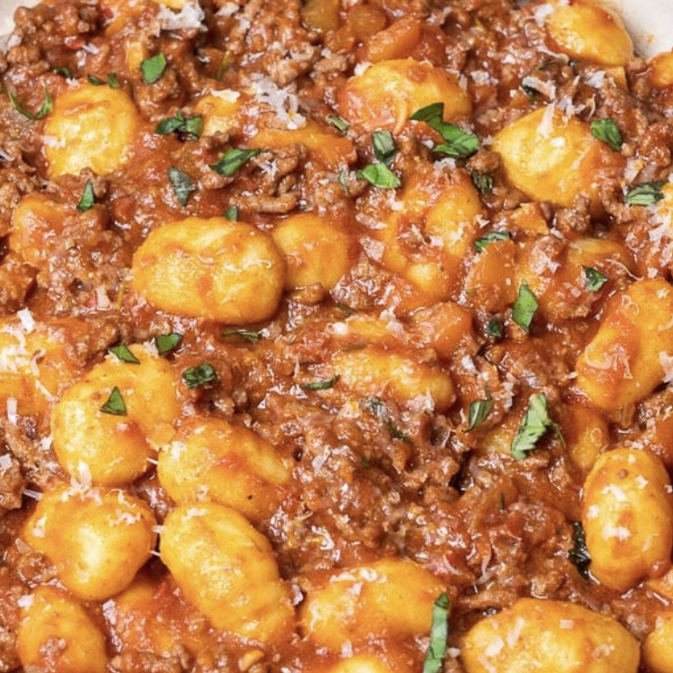 Gnocchi pasta con salsa pomodoro con carne de res y cerdo