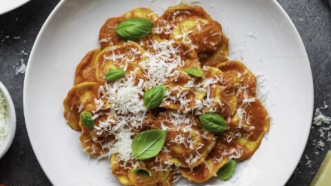 Ravioli rellenos de una cremosa mezcla de espinaca y ricotta con salsa Pomodoro
