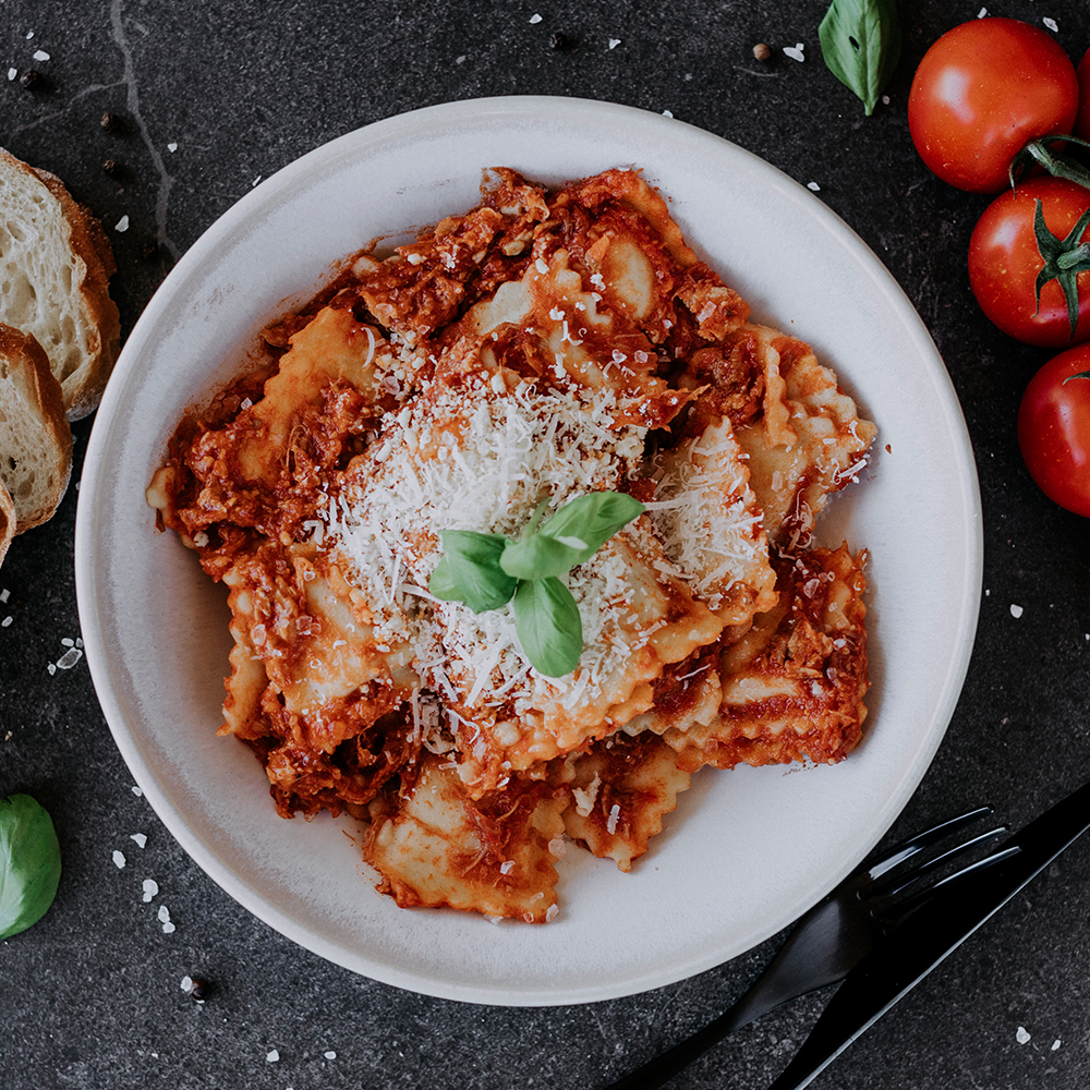 Ravioli rellenos de una cremosa mezcla de cuatro quesos con salsa bolognesa.