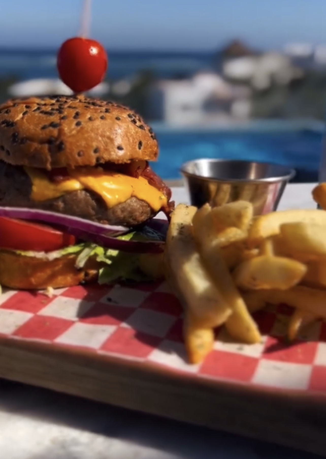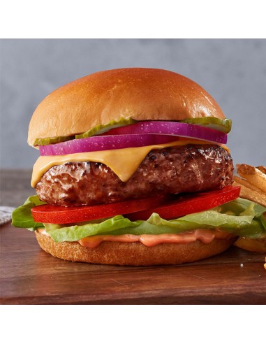Hamburguesa a la Parrilla con Lechuga, Tomate. Cebolla, Queso, Tocino y Papas a la Francesa.
